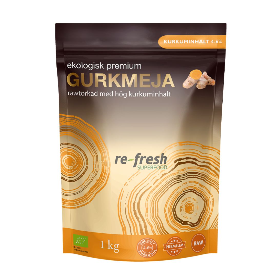 Re-fresh Superfood Gurkmeja Pulver är ett ekologiskt kosttillskott med curcumin. Pulvret innehåller ca 5-7% curcumin. Kosttillskottet framställs från torkad och mald gurkmeja. Inom den Indiska läkekonsten Ayurvedan har gurkmeja använts i över 4000 år.